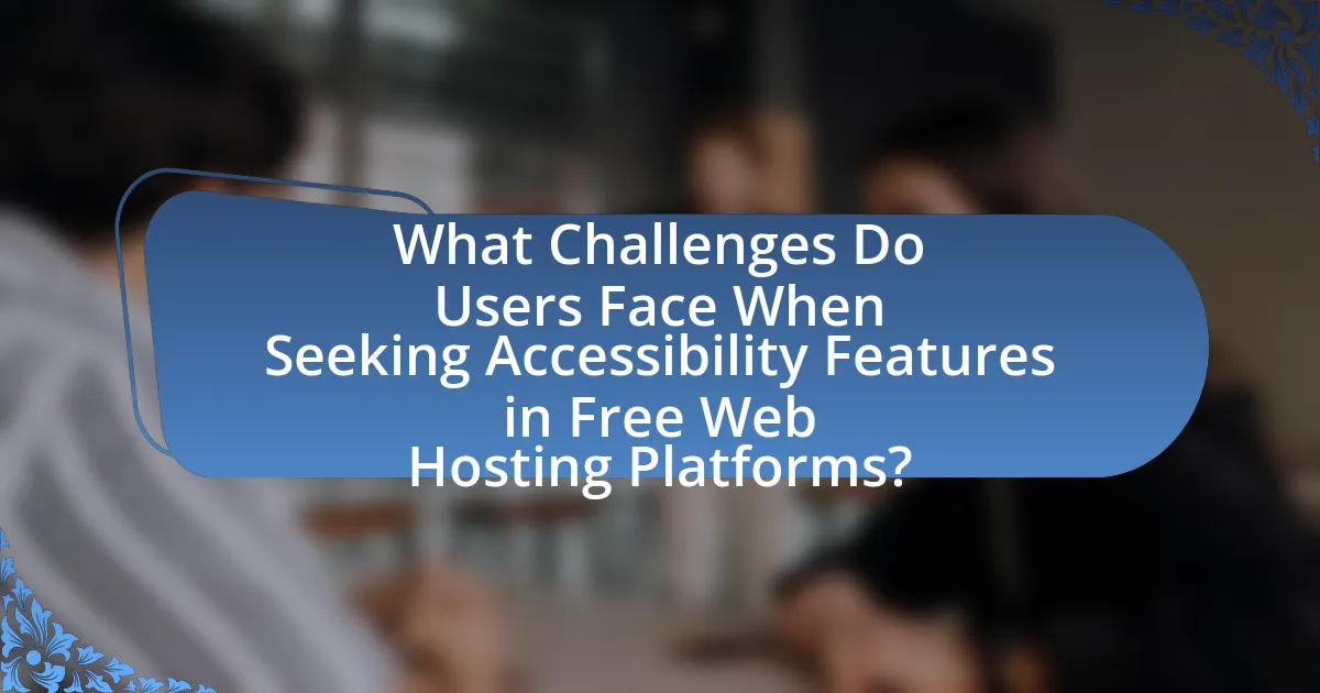 Users face several challenges when seeking accessibility features in free web hosting platforms, primarily due to limited resources and inadequate support. Many free platforms lack comprehensive accessibility tools, such as screen reader compatibility and keyboard navigation options, which are essential for users with disabilities. Additionally, the documentation provided by these platforms often fails to address accessibility concerns, leaving users without guidance on how to implement necessary features. A study by the World Wide Web Consortium (W3C) highlights that over 70% of free web hosting services do not meet basic accessibility standards, further complicating the user experience for those seeking inclusive web solutions.